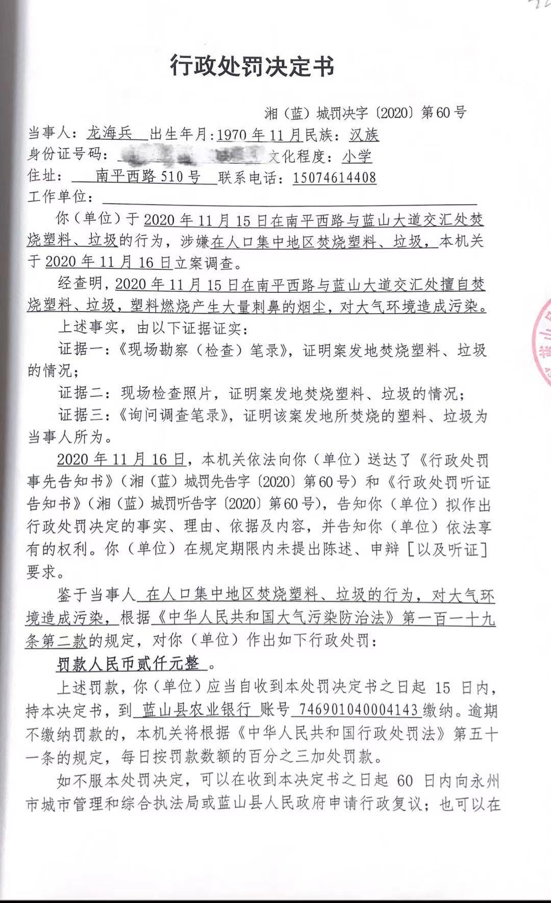 关于龙海标在南平路与蓝山大道交汇处焚烧塑料、垃圾的行为的处罚
