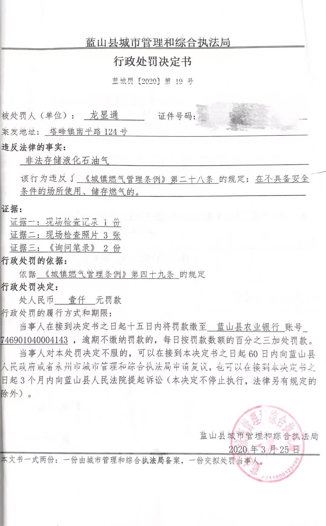 关于龙显通在不具备安全条件的场所使储存燃气的处罚