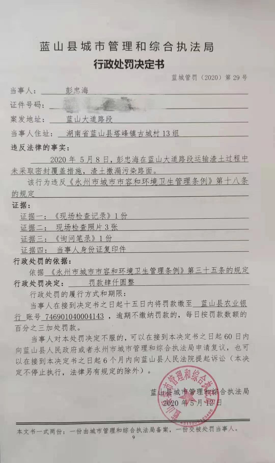 关于彭忠海在蓝山大道路段运输渣土过程中未采取密封覆盖措施,渣土撒漏污染路面的处罚