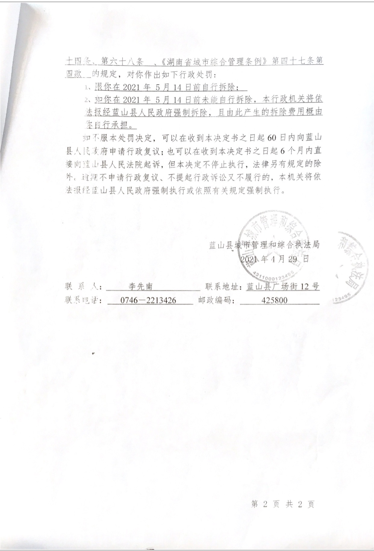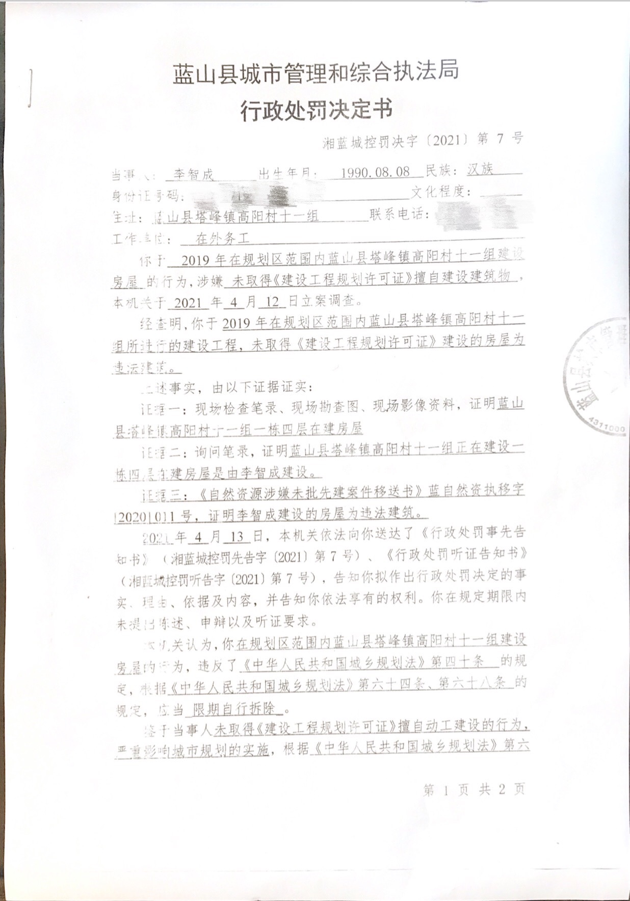 关于李智成在规划区内蓝山县塔峰镇高阳村十一组所建设的项目,因未取得《建设规划许可证》而擅自动工建设的处罚