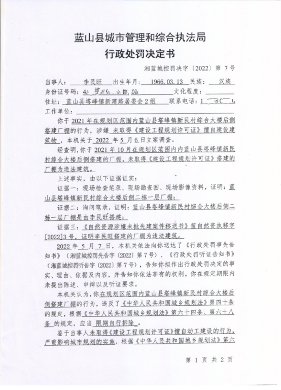 关于李民旺未取得《建设工程规划许可证》擅自建设建筑物的处罚决定