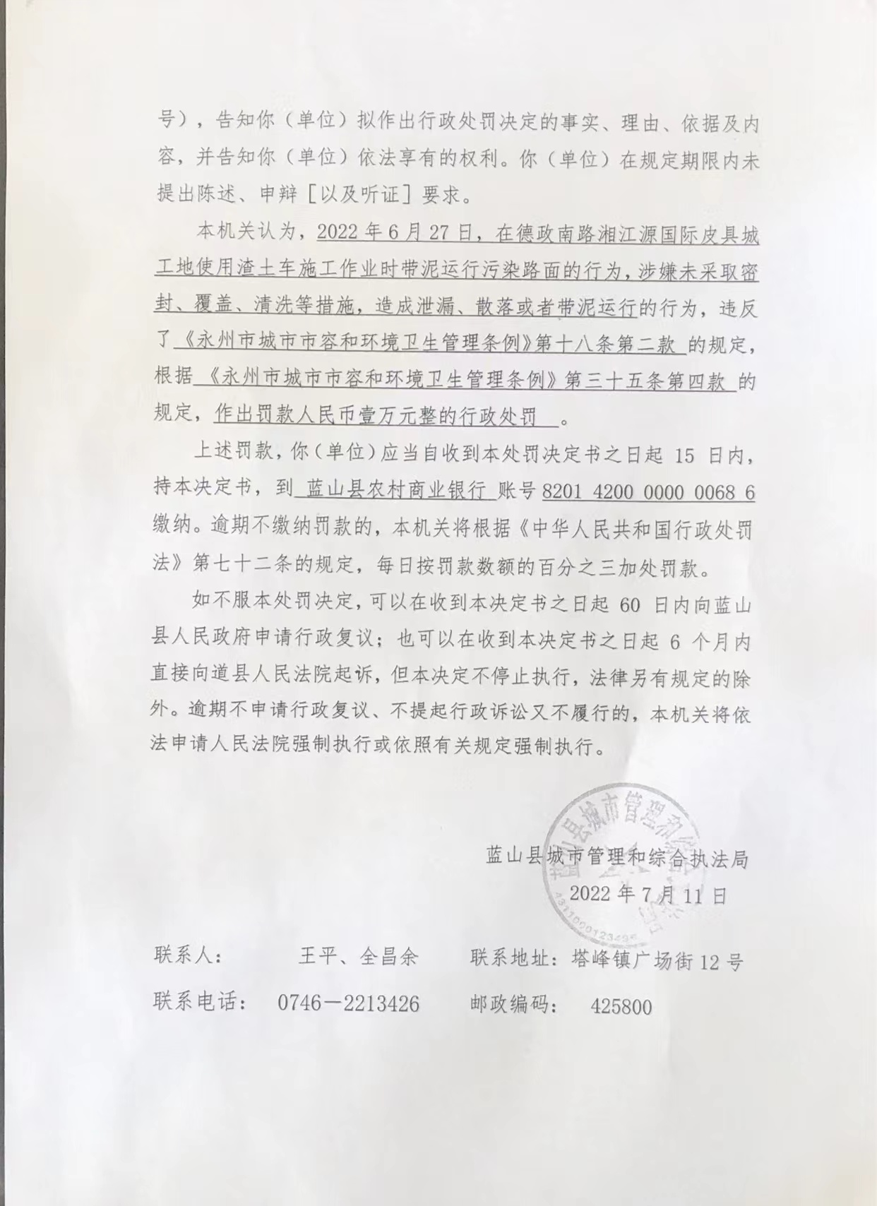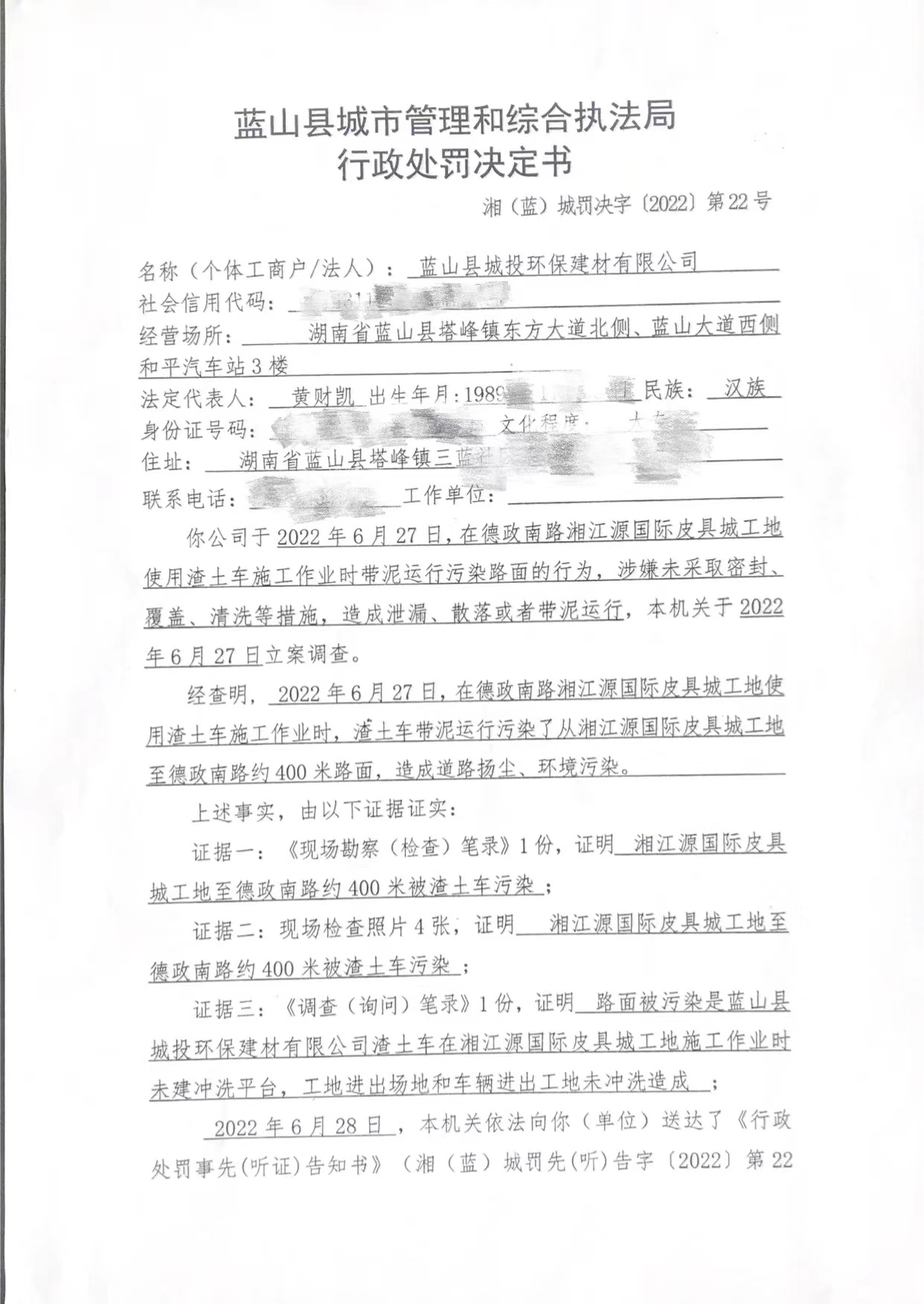 关于蓝山县城投环保建材有限公司在东方大道使用渣土运输车作业时带泥运行污染路面的处罚