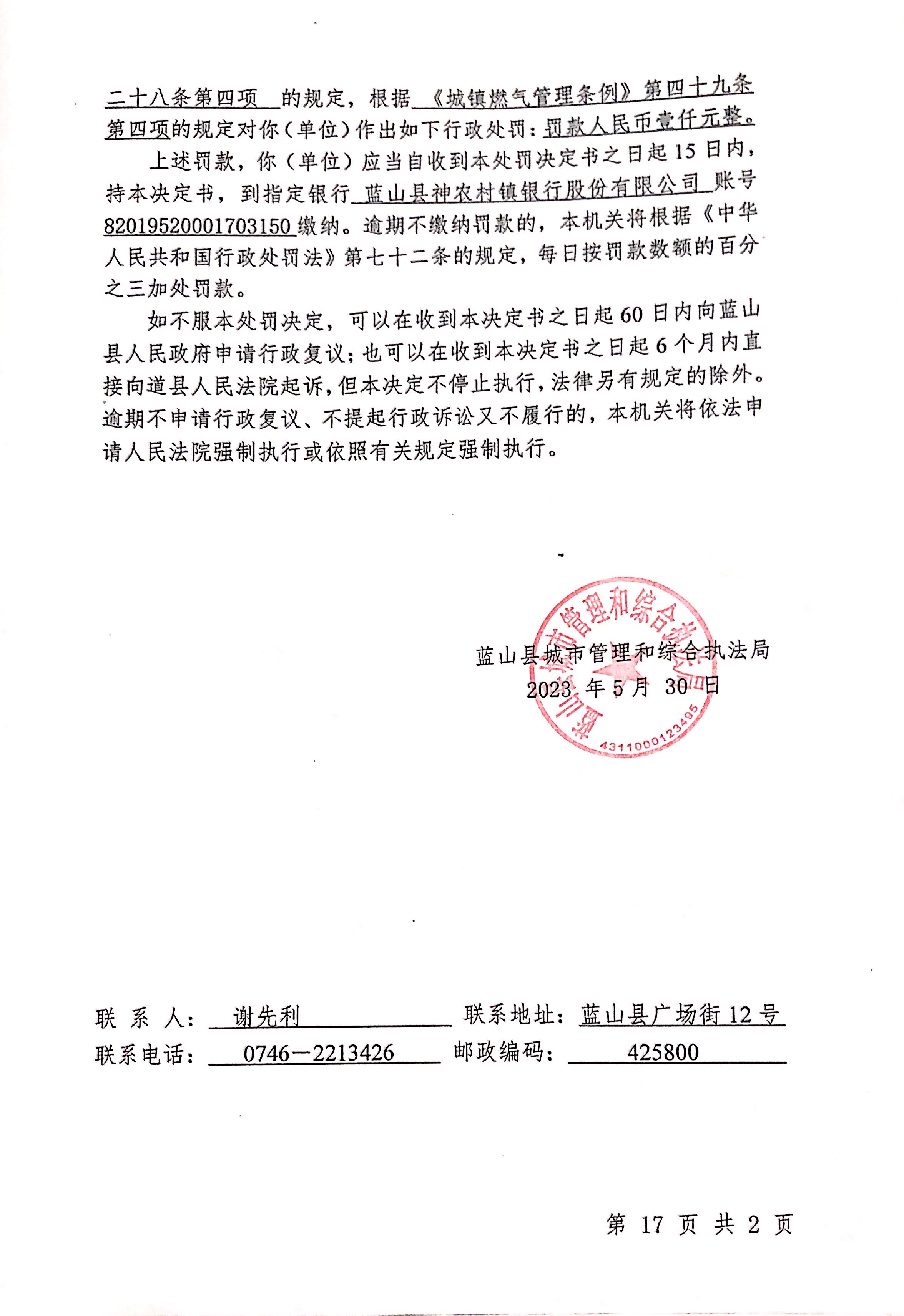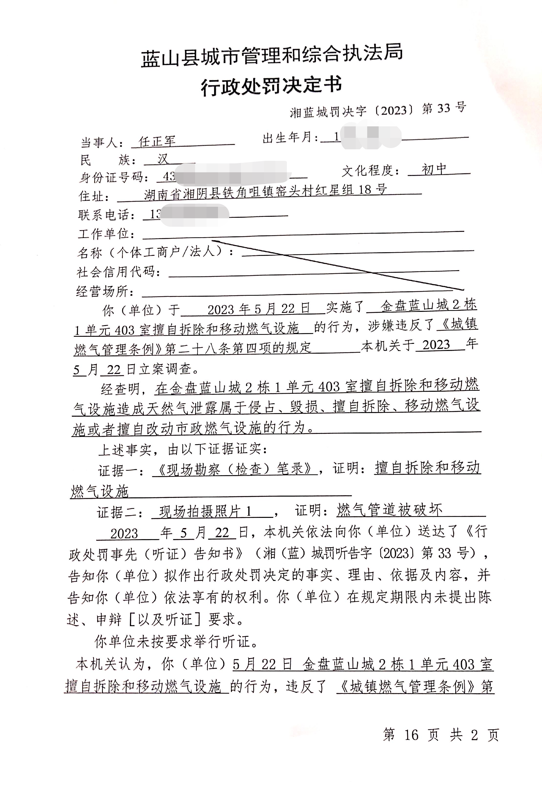 关于对任正军擅自拆除和移动燃气设施的行为的处罚