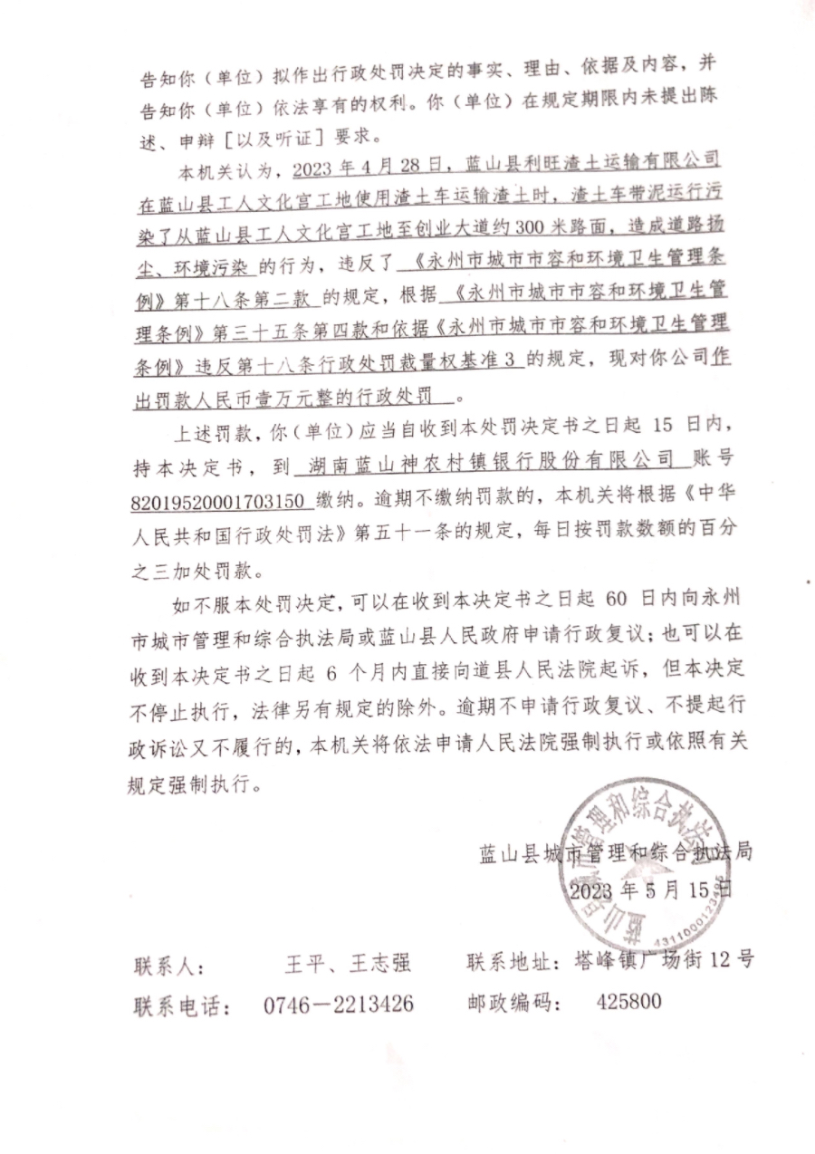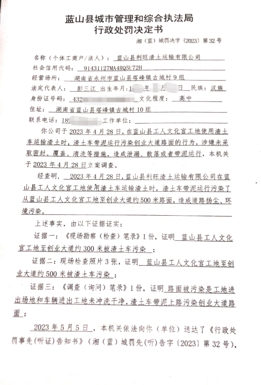 关于彭三江使用渣土车带泥运行污染道路的处罚