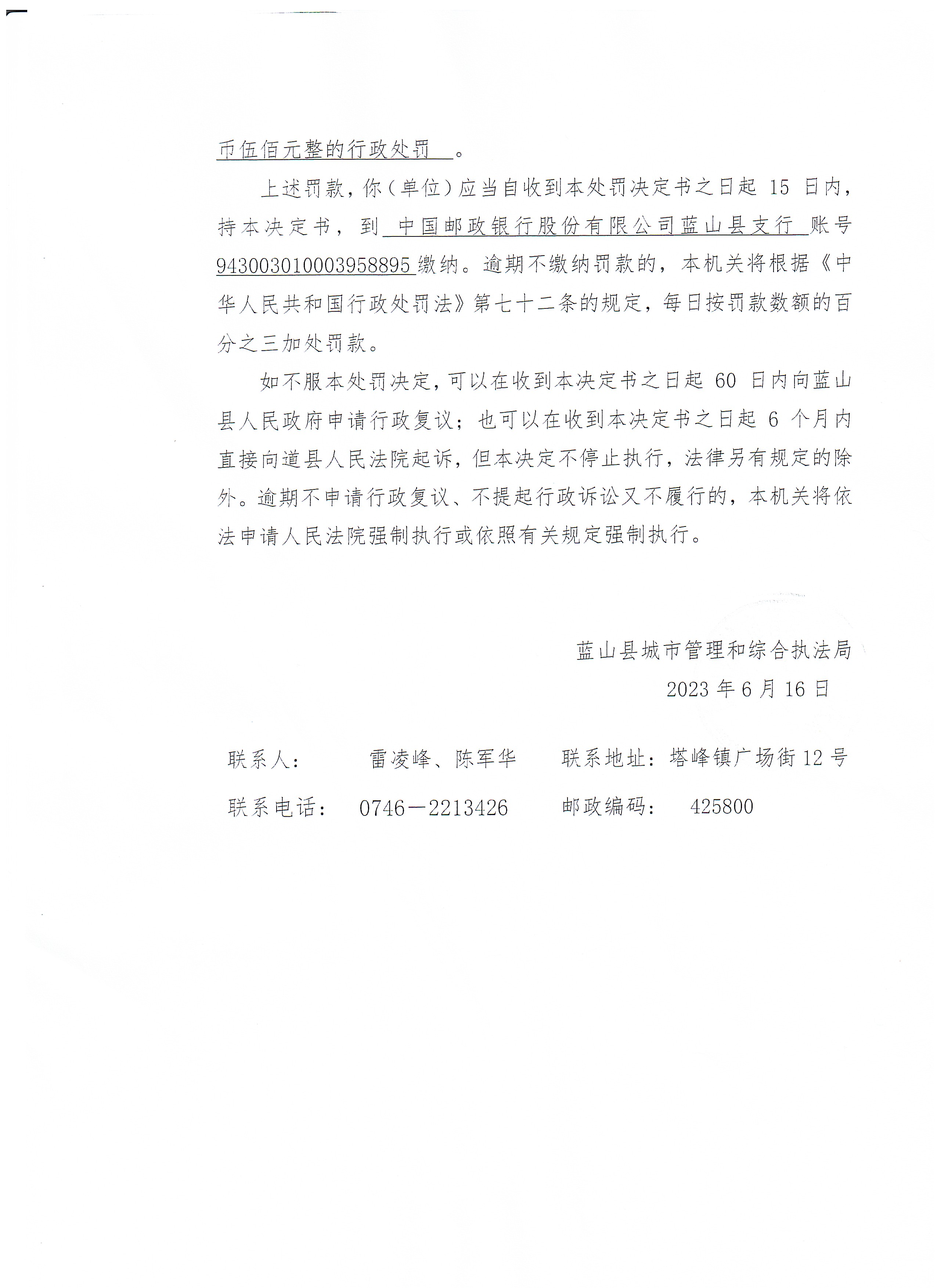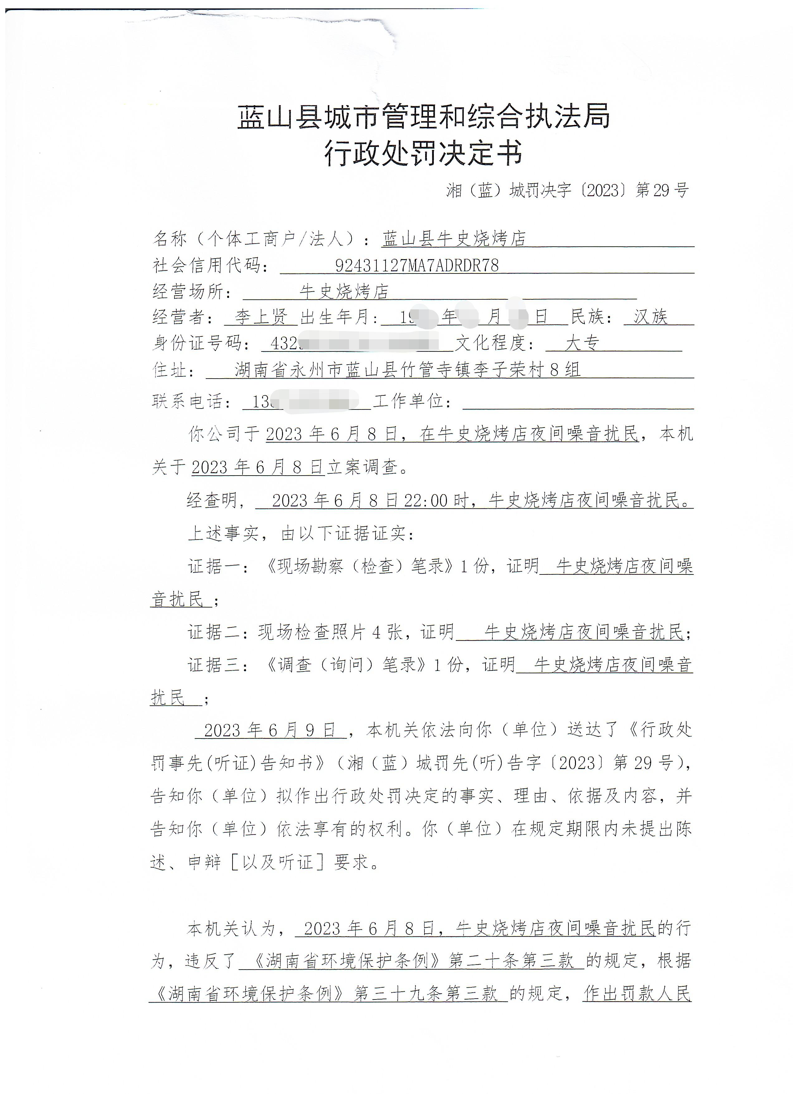 关于对蓝山县牛史烧烤店夜间噪音扰民的处罚