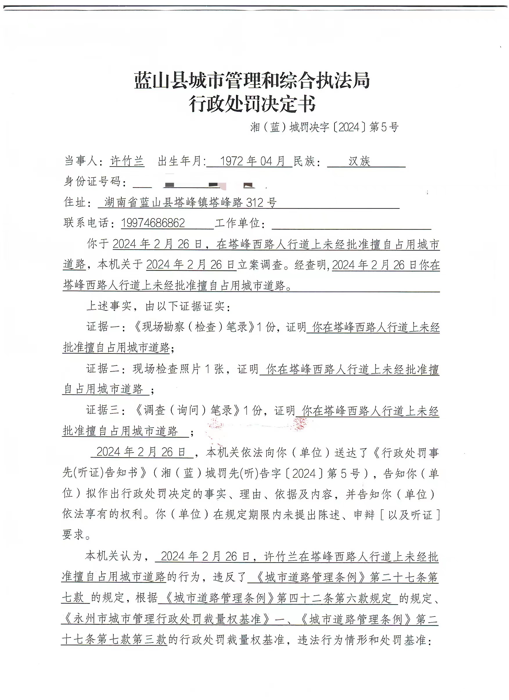 关于对许竹兰在塔峰西路人行道上未经批准擅自占用城市道路行为的处罚