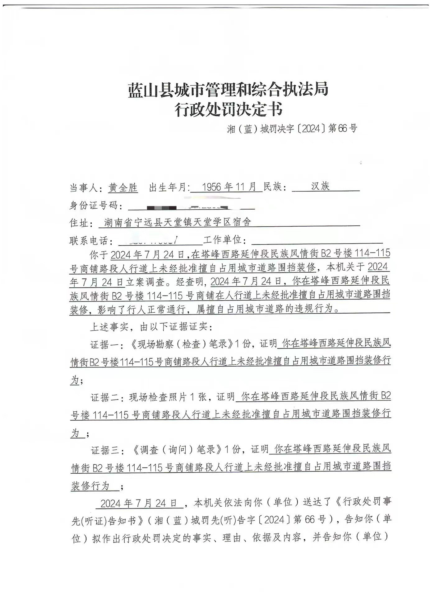 关于对黄全胜在塔峰镇西路延伸段民族风情街B2号楼114-115号商铺路段人行道上未经批准擅自占用城市道路围挡装修行为的处罚