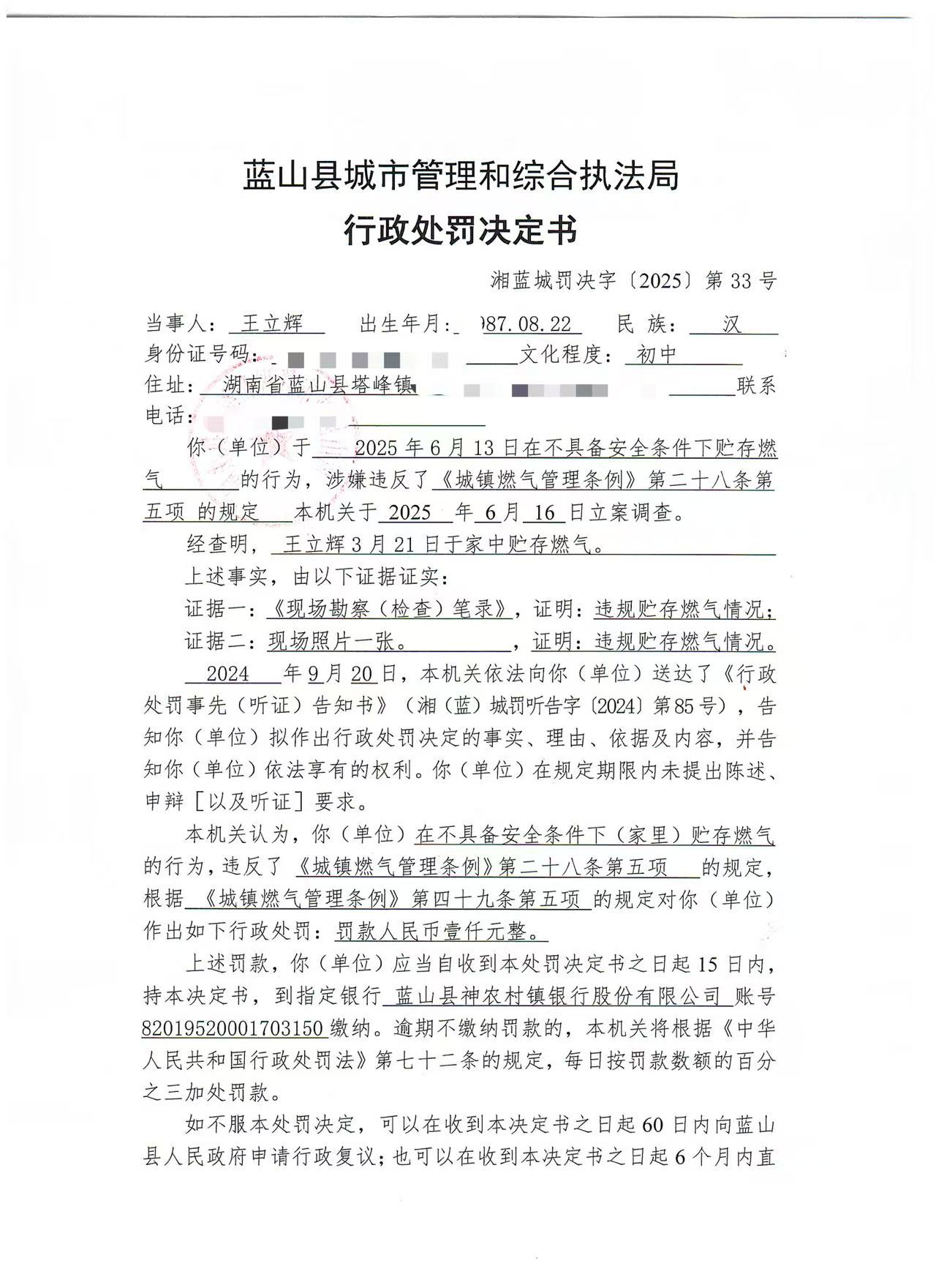 关于对王立辉在不具备安全条件下贮存燃气行为的处罚