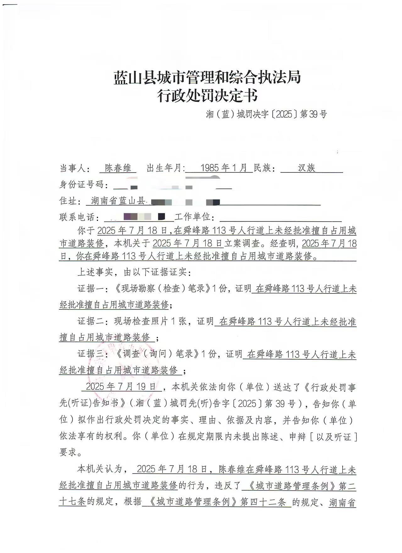 关于对陈春维在舜峰路113号人行道上未经批准擅自占用城市道路装修行为的处罚