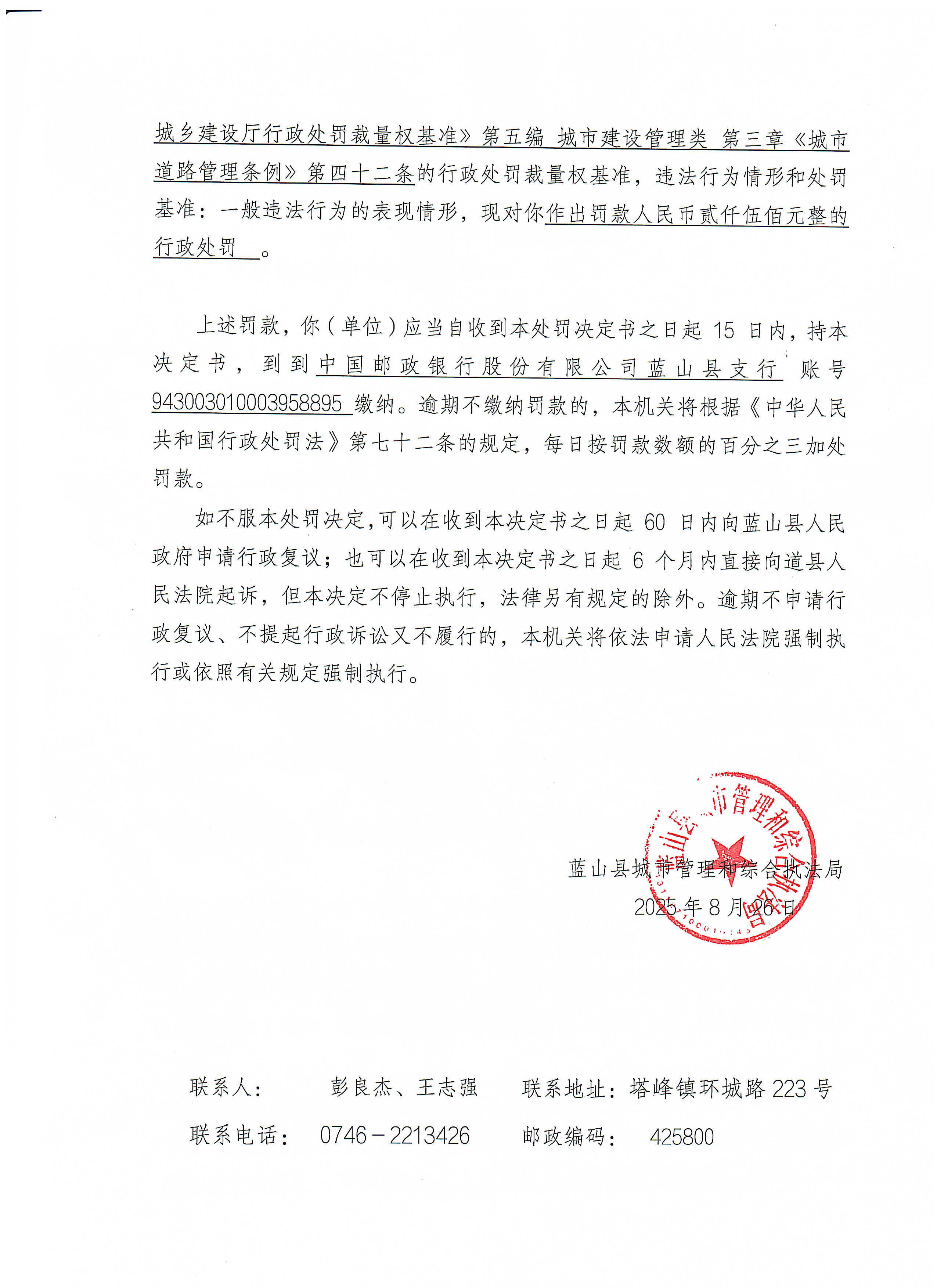 关于对王伟春在塔峰路与湘粤路交叉口擅自挖掘城市道路行为的处罚