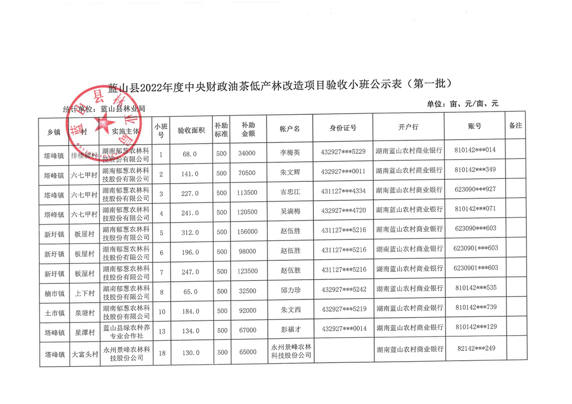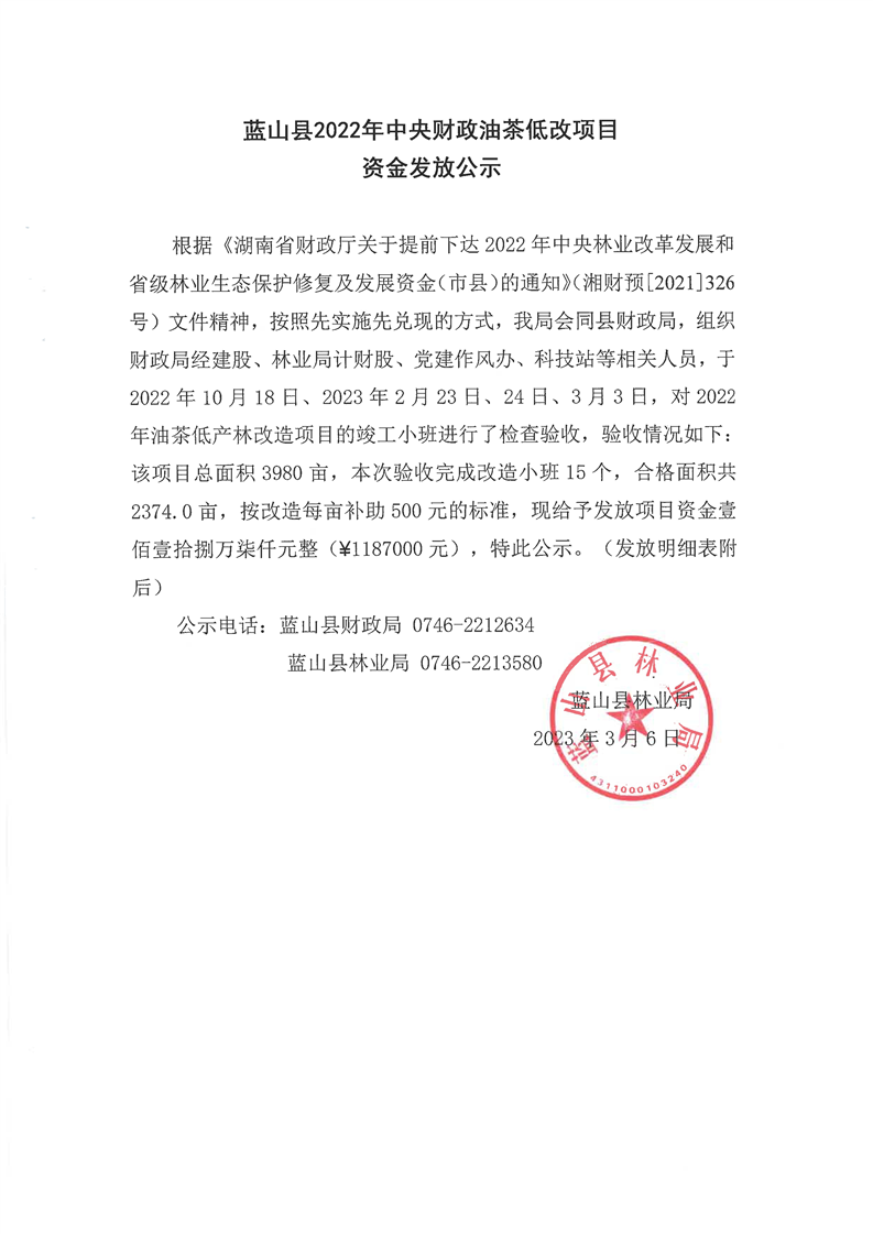 蓝山县2022年中央财政油茶低改项目资金发放公示