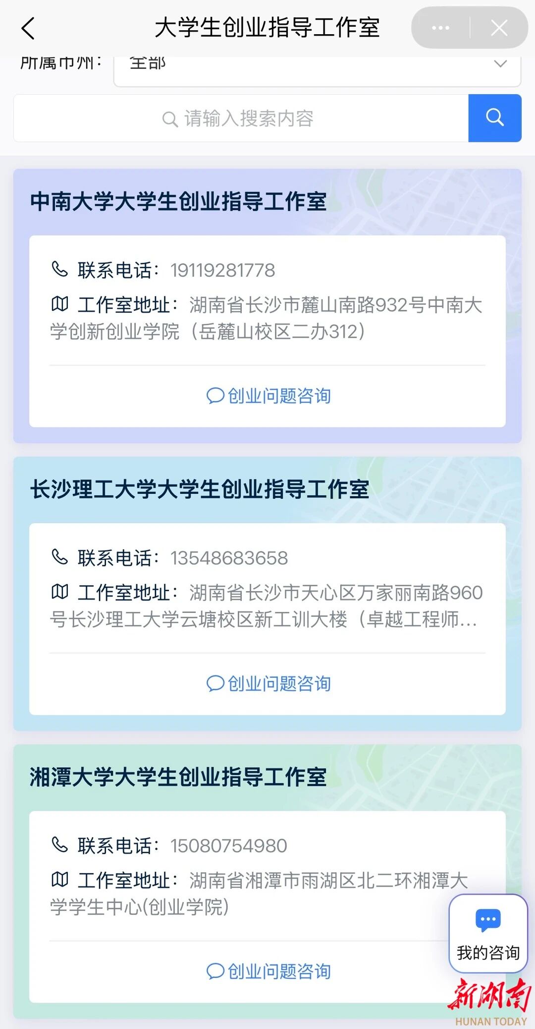 还有中南大学、长沙理工大学等高校创业指导工作室提供本校化、精准化的线下咨询与帮扶。