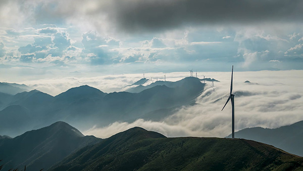 连日来,受冷空气持续南下影响,蓝山县云冰山持续出现壮美云海景观。透过无人机镜头俯瞰,只见雪白的云雾或翻过山巅如瀑布般直流而下,或穿过峡谷奔涌向前,与南下的冷空气形成对流之势。群峰在云海中若隐若现,起伏连绵,一座座高大的风车错落有致地矗立在山脊之上,云雾似有生命般穿越山峦奔涌而来,茫茫云海铺满整个天际,气势磅礴,蔚为壮观。蓝山县位于南岭山脉中段北侧,霜降前后南下的冷空气受山脉阻挡,云海频发,因此,这个时候云海出现的次数要远远多于平时。