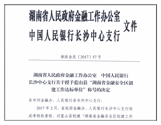 2017年2月至7月,经过省金融办、人行长沙中支的考核验收,省金融安全区创建工作联席会议的评审及省政府门户网站的公示后,蓝山县最终获得了“湖南省金融安全区创建工作达标单位”的荣誉称号。