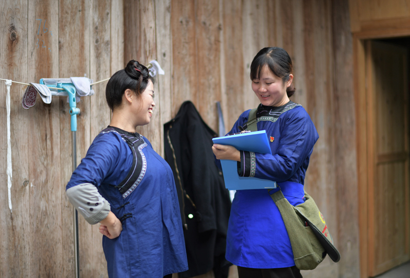 贵州省黔东南苗族侗族自治州榕江县平江镇巴鲁村网格员刘园(右)走访结对帮扶户时,与村民韦福琴核对生产生活情况(2020年11月16日摄)。新华社记者 杨楹 摄