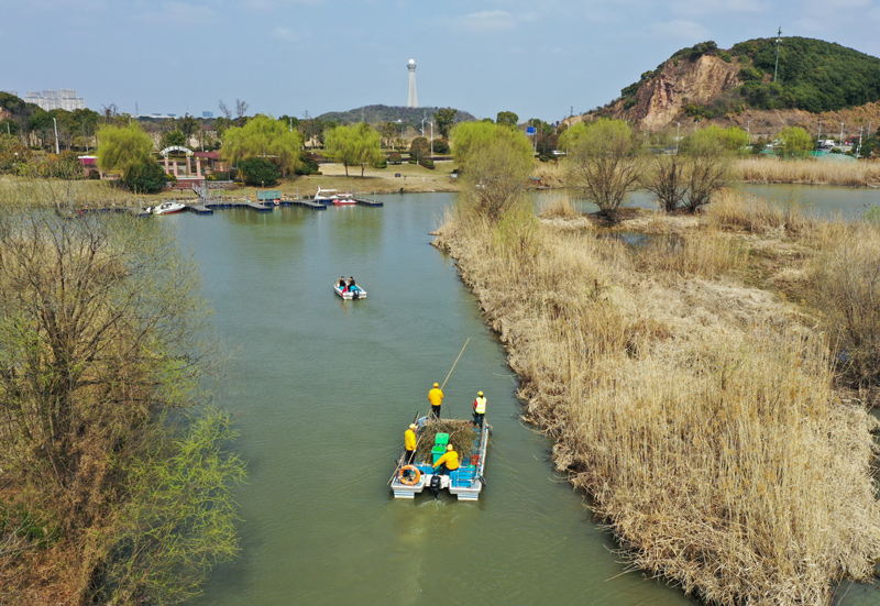 2021年2月24日,浙江湖州吴兴区八里店镇移沿山村河长带队在移沿山村长漾开展巡河、保洁作业(无人机照片)。新华社记者 翁忻旸 摄