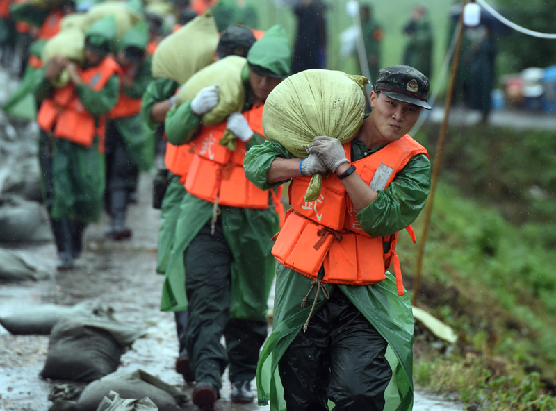 2020年7月16日,在安徽无为长江大堤外护圩三垄圩段,武警安徽总队芜湖支队的官兵在搬运沙袋,准备加固子埂。新华社记者 周牧 摄