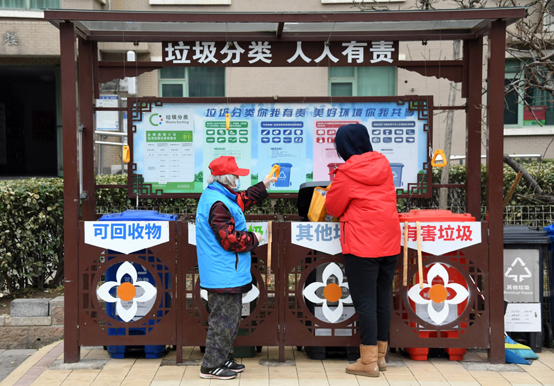 在北京市海淀区北太平庄街道金晖远洋社区,今年83岁的邰玉珍(左)指导社区居民倒垃圾(2021年3月5日摄)。邰玉珍是一名有着65年党龄的共产党员,退休后,她积极参与社区志愿服务。新华社记者 任超 摄