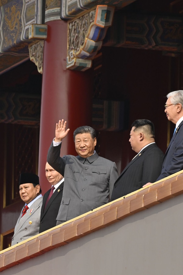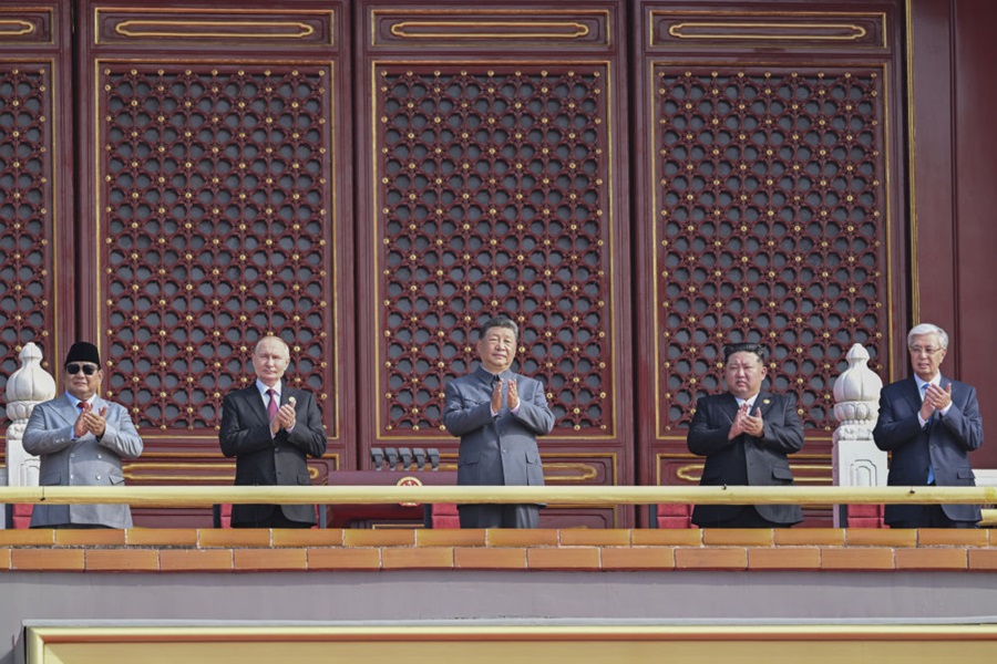 9月3日,纪念中国人民抗日战争暨世界反法西斯战争胜利80周年大会在北京天安门广场隆重举行。这是大会开始前,中共中央总书记、国家主席、中央军委主席习近平同出席大会的外方代表团团长前往天安门城楼。新华社记者 申宏 摄