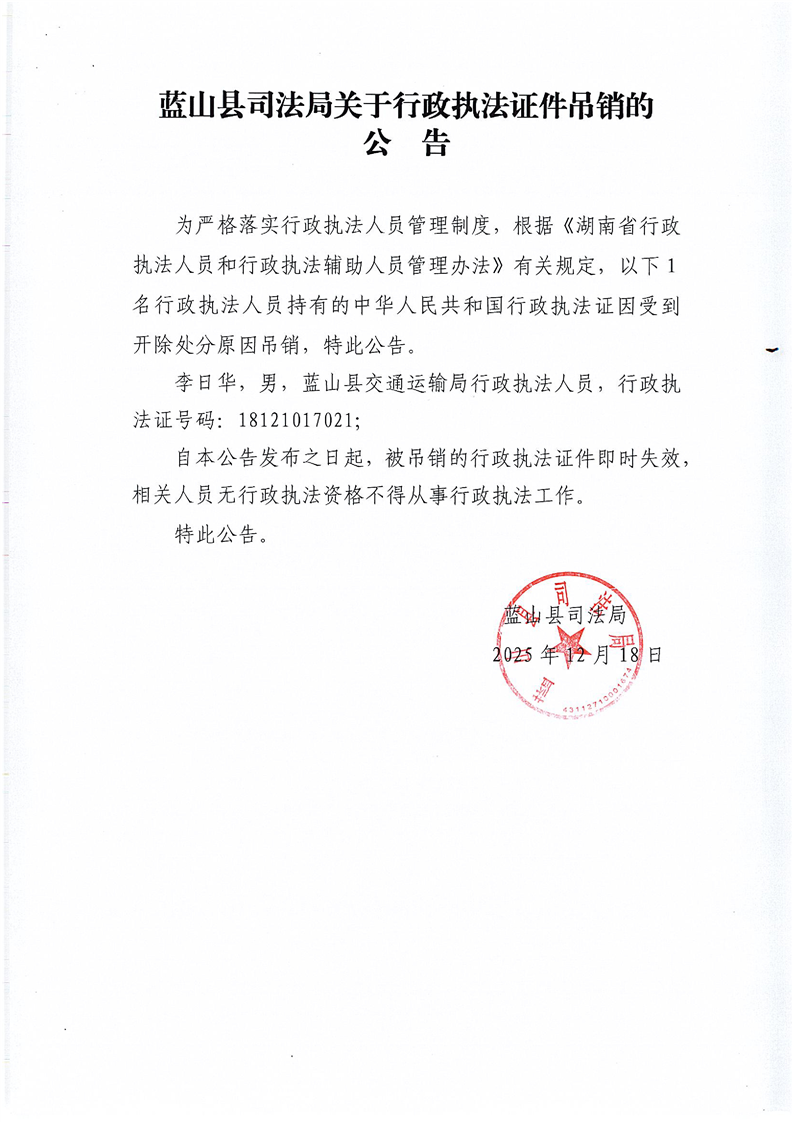 蓝山县司法局关于行政执法证件吊销的公告