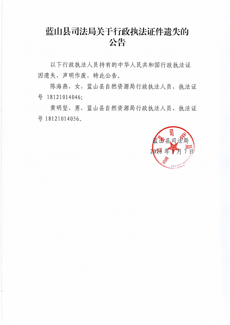 蓝山县司法局关于行政执法证件遗失的公告
