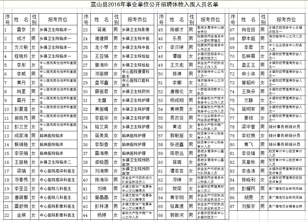 蓝山县2016年事业单位公开招聘体检人员名单及体检时间公示