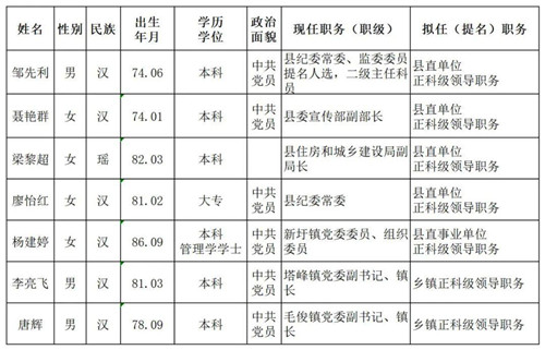 为加强对干部选拔任用工作的监督,提高识别和任用干部的准确程度,现对县委常委会议研究决定的下列7名拟任(提名)人选进行任前公示: