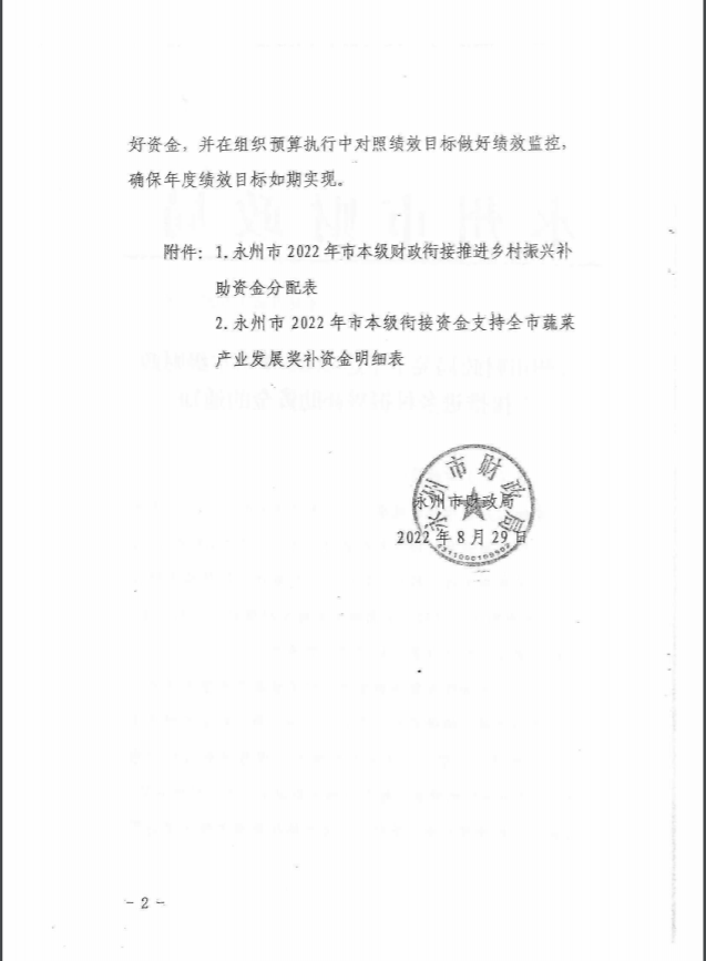 永州市财政局关于下达2022年市本级财政衔接推进乡村振兴补助资金的通知