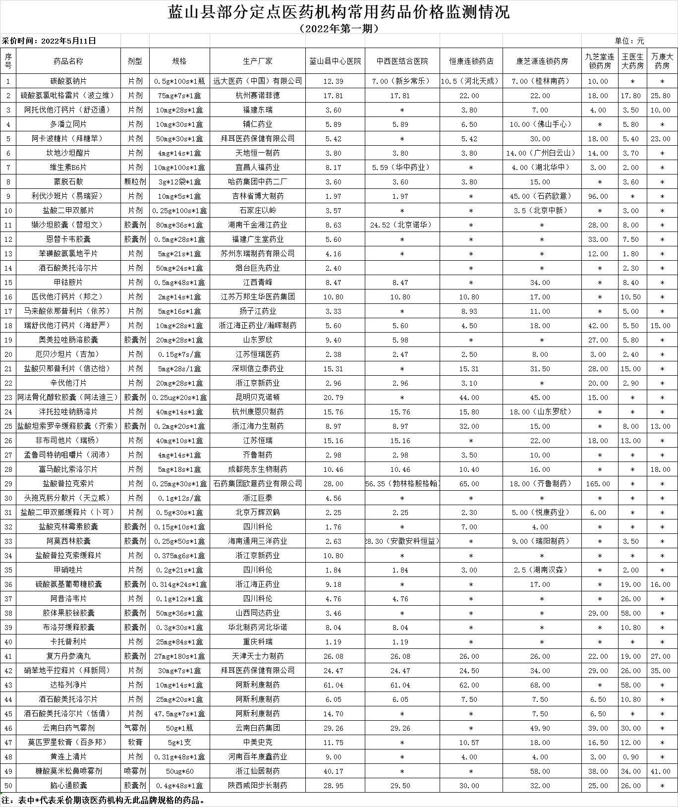 为了充分发挥“医保”药品价格信息对市场的引导作用,规范定点医药机构价格行为,强化社会监督,促进经营者合理制定药品销售价格,引导消费者合理选购药品,并对药品市场销售情况进行监测。根据《国家医疗保障局关于印发关于做好当前药品价格管理工作的意见的通知》(医保发〔2019〕67号)和《零售药店医疗保障定点管理暂行办法》(医保局令3号)精神,蓝山县医疗保障局制定了《蓝山县医保定点医药机构常规药品价格信息监测与发布制度(试行)》。现在全县选取7家经营规模较大、品种较全的定点医药机构做为常规药品价格监测单位,对市场销售量较大、社会关注度高的降血脂、降血压、治疗糖尿病等10类50种药品进行定期价格监测与公示。