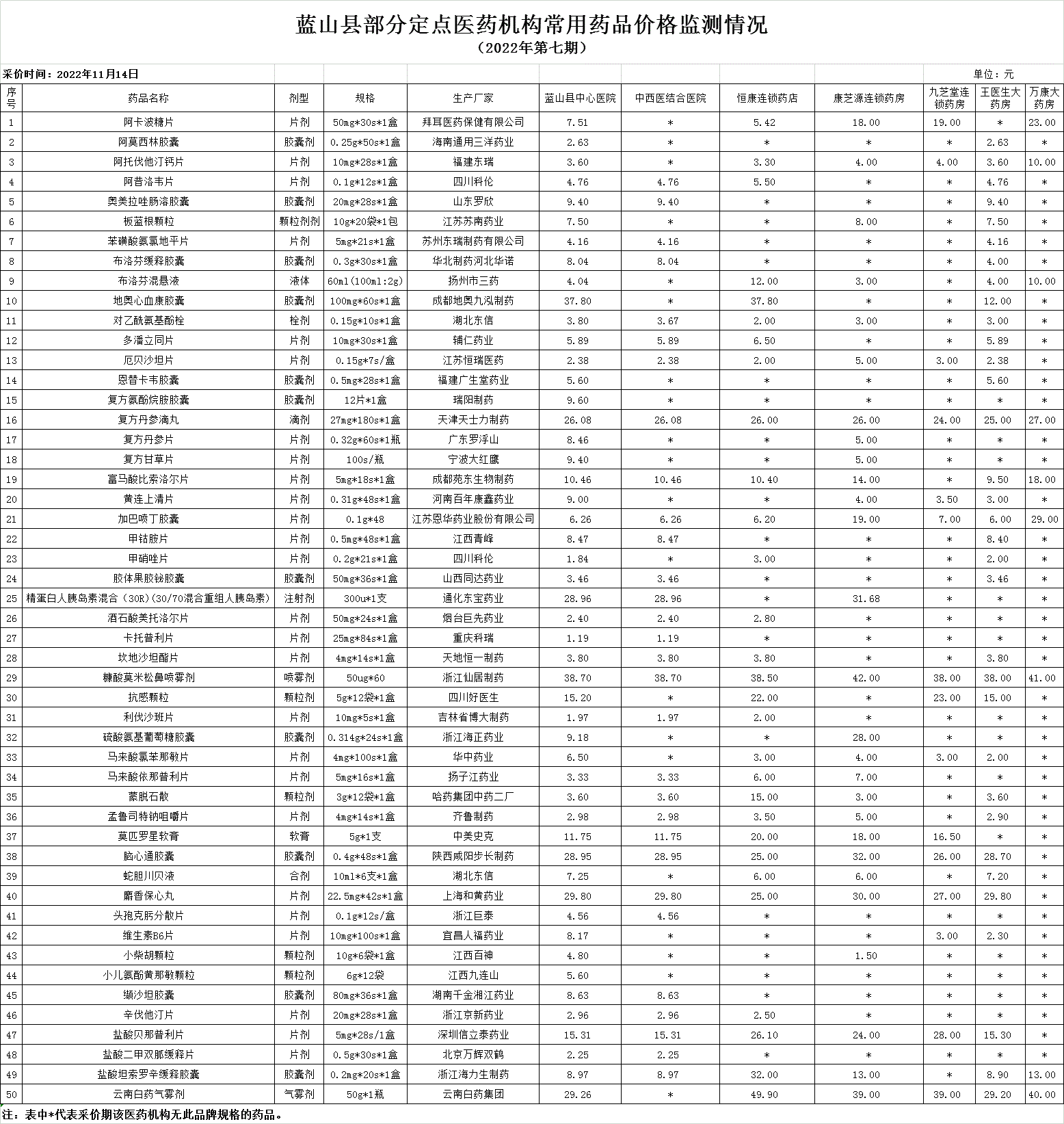 蓝山县部分定点医药机构常用药品价格监测情况(2022年第七期)