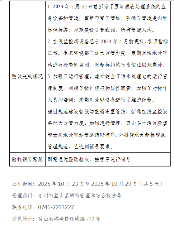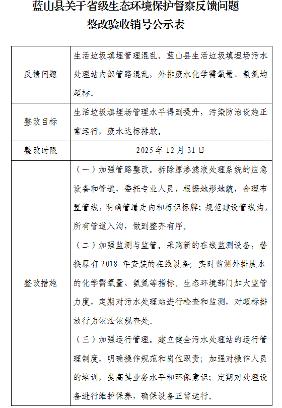 蓝山县关于省级生态环境保护督察反馈问题整改验收销号公示表