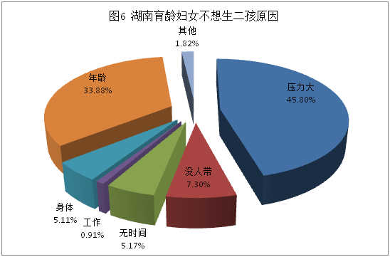 (四)其他客观条件制约。育儿成本、生活压力、婚育观念等等因素都会对生育产生制约,从不想生的主要原因来看,经济压力、年龄问题、没人带成为制约二胎生育意愿的三大主要因素(见图6),分别占到了调查样本的45.80%、33.88%和7.30%。其中养育成本高、经济压力大无疑是最主要原因,在20-29岁生育旺盛期育龄妇女中体现得尤为明显;年龄问题则在70后妇女中反映得比较强烈。