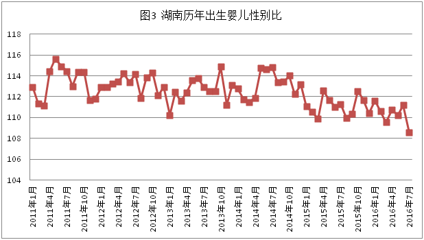(三)出生婴儿性别比持续下降。数据显示(见图3),全省出生婴儿性别比在逐年下降,逐步向正常水平回归。这说明随着单独二孩、全面二孩等生育政策的陆续放开,生育上的性别偏好得到了一定满足,再加上随着时代的发展,人民群众生育观念也日益改变,生育上的性别歧视和选择性生育问题得到一定控制。