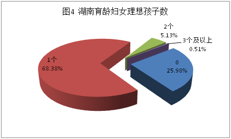 从育龄妇女理想孩子数调查情况看(见图4),只想要一个孩子的也高达68.38%,想生两个的只有5.13%,而不想要孩子的竟然高达25.98%,这个结果确实让人吃惊。其中,二胎意愿最低的恰恰是生育能力最旺盛的20-29岁年龄段,想要两个孩子的只占了调查总数的3.43%。