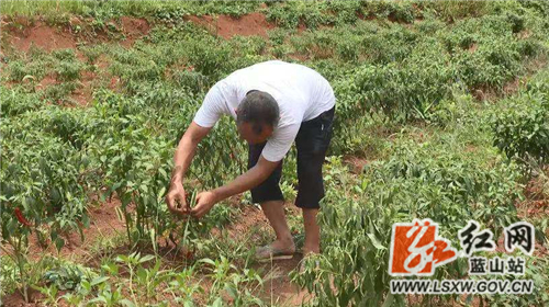 在新圩镇株木水村辣椒种植基地,一株株辣椒丛上挂满了鲜亮翠绿的小辣椒,村支书谭荣强顶着烈日正在地里采摘辣椒。去年谭荣强试种了70亩辣椒后觉得效益不错,于是今年扩大了种植规模,承包了240亩地全部用于辣椒种植。