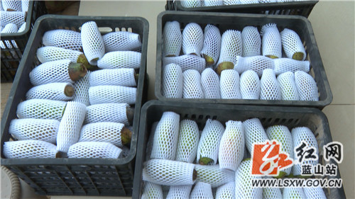 而在基地外的公司里,专门负责销售八月瓜的景峰农林公司销售经理吴青凤正带着员工们手脚麻利地挑选着精品鲜果,将一个个新鲜的八月瓜套上水果网套,不到一会儿,一箱箱八月瓜便整整齐齐地码在了果箱内,随时准备安排发往全国各大水果批发市场。