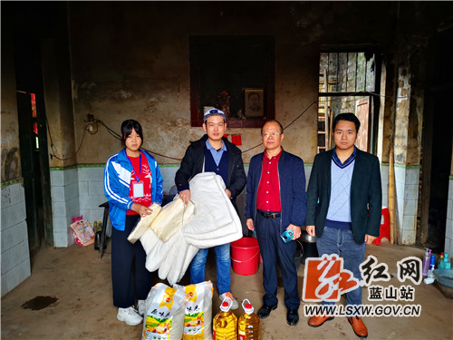 10月15日,蓝山县关工委、县民政局一同前往三蓝学校九年级贫困学生余萱莹家中,并送去棉被两床以及米、食用油等物品,帮助她家度过寒冷的冬天。