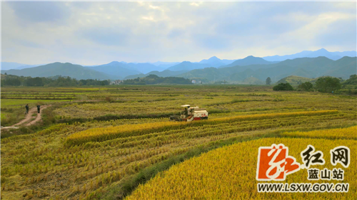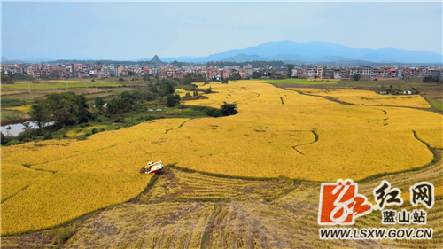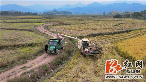 金秋十月,蓝山县11万亩晚稻进入成熟期,一台台收割机在田间来回穿梭,一辆辆运输车在乡间小路上不停转运,到处呈现出一派繁忙的秋收景象。