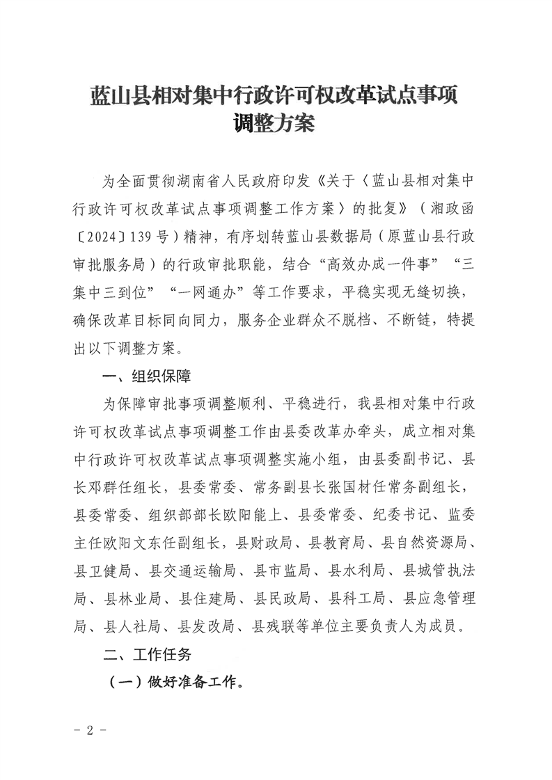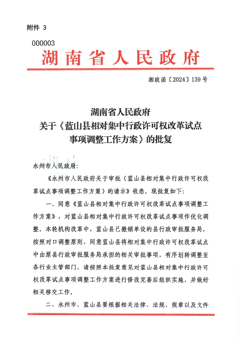 蓝山县人民政府办公室关于印发《蓝山县相对集中行政许可权改革试点事项调整方案》的通知