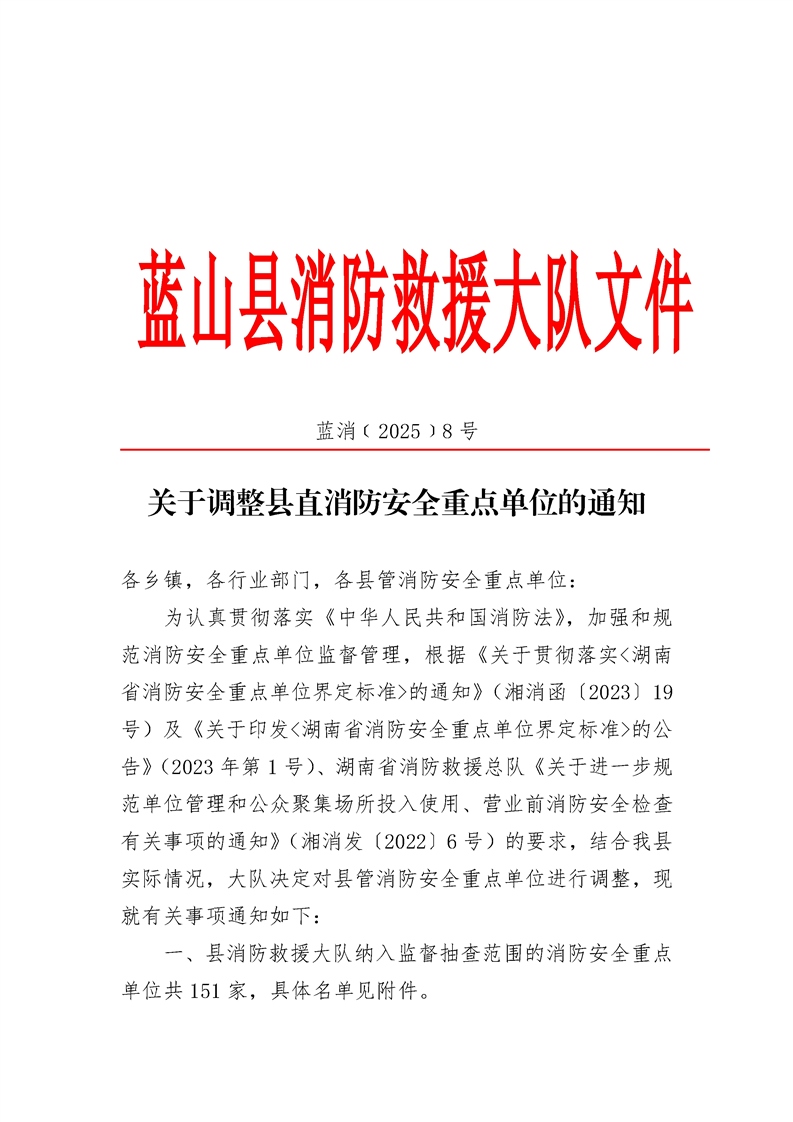 关于调整县直消防安全重点单位的通知