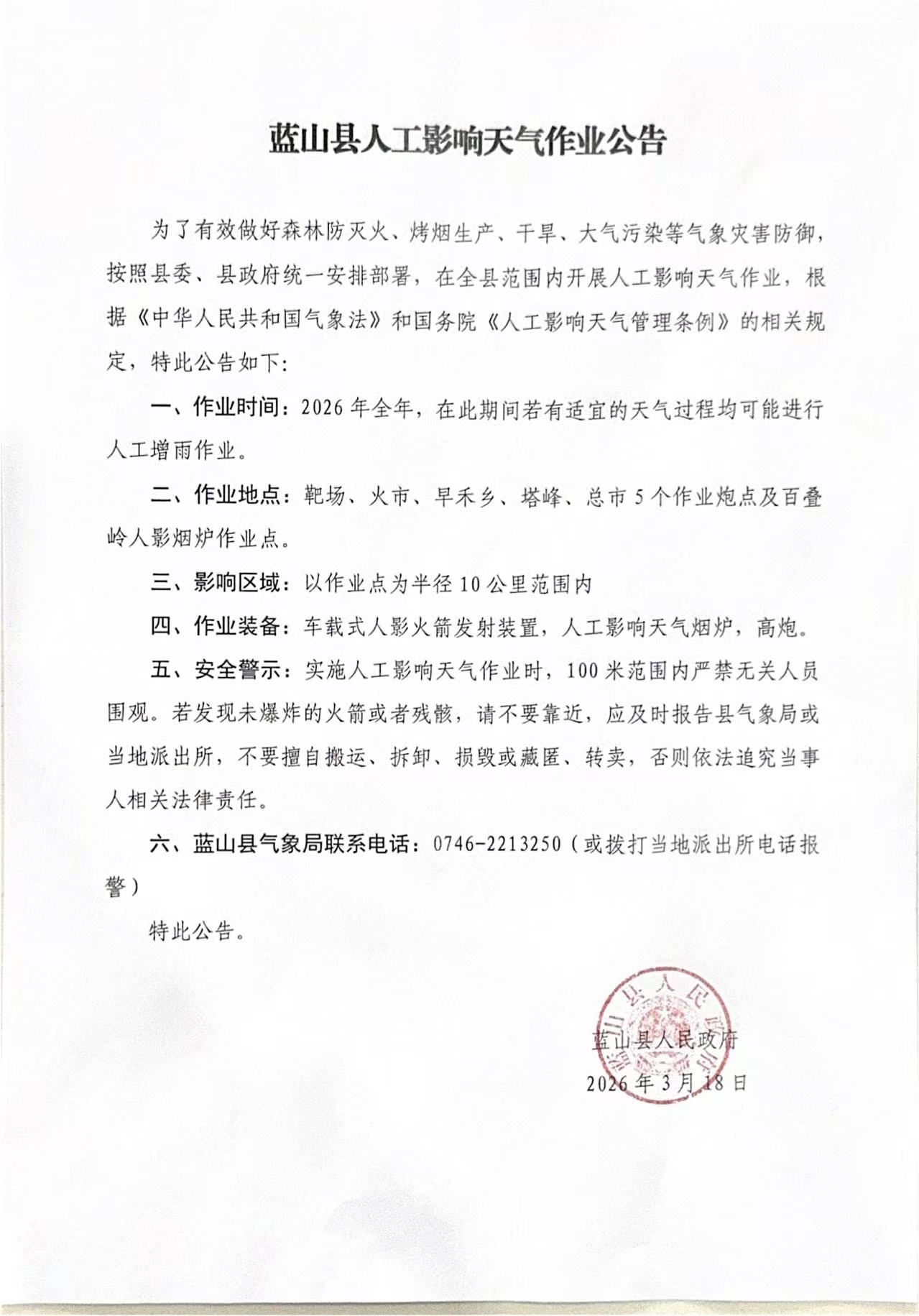 蓝山县人民政府:蓝山县人工影响天气作业公告