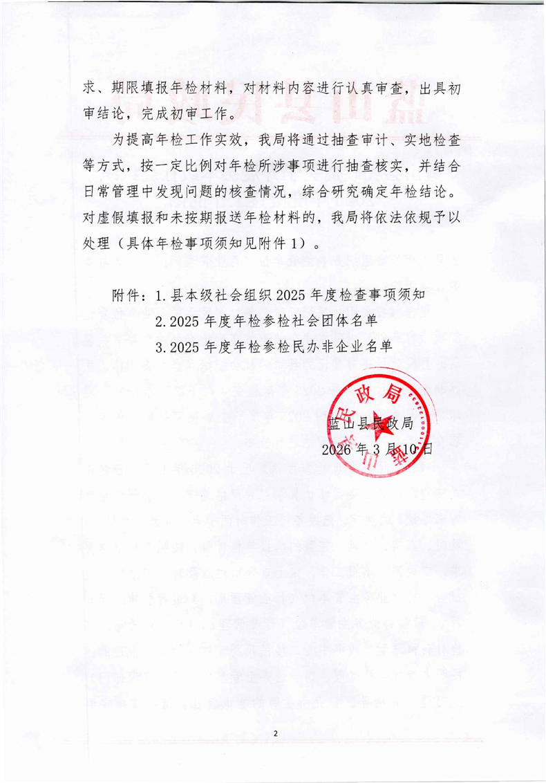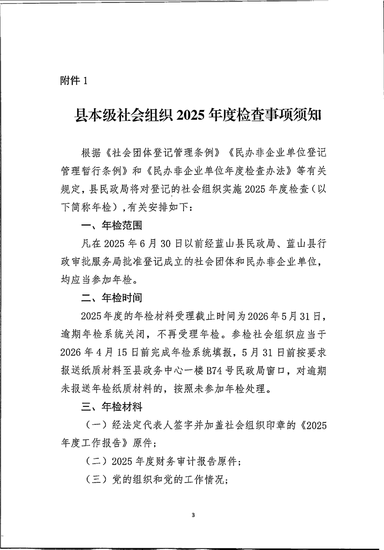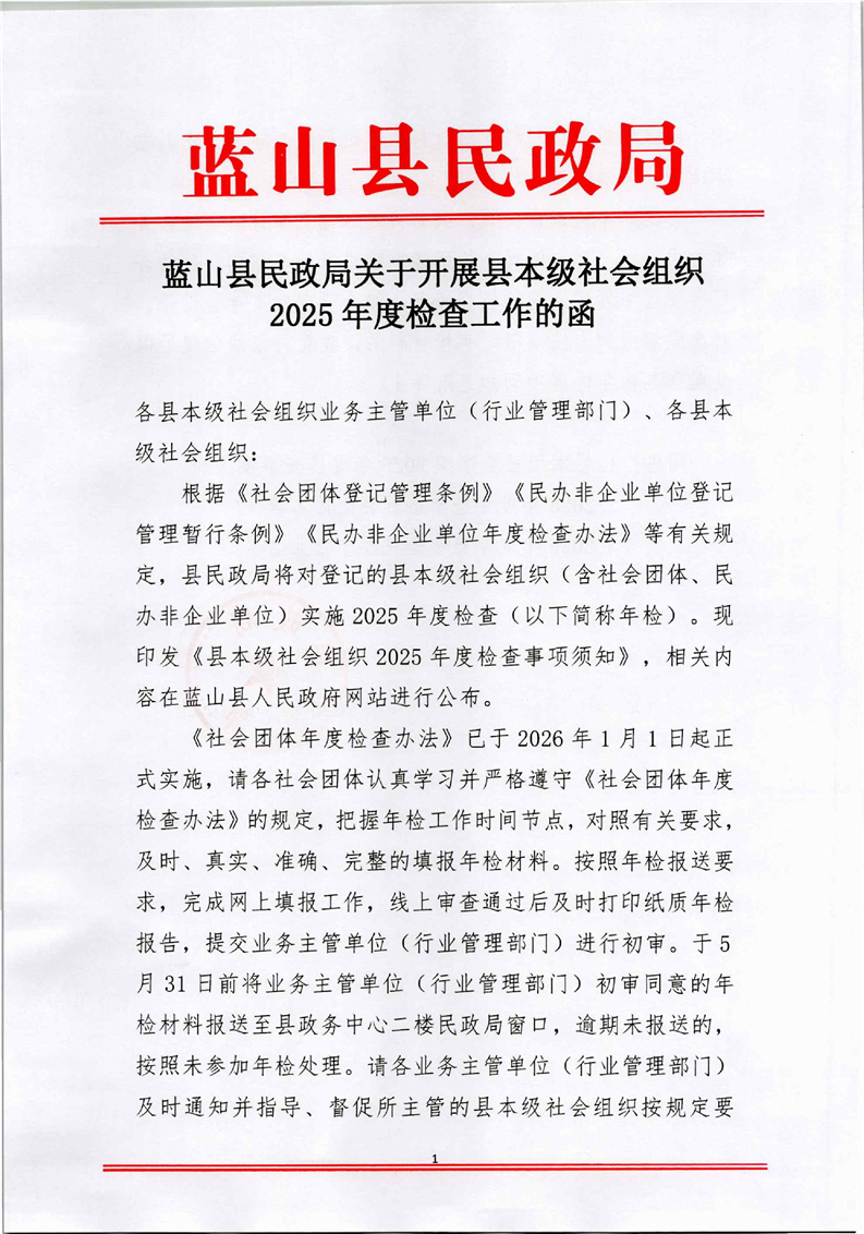 蓝山县民政局关于开展县本级社会组织2025年度检查工作的函