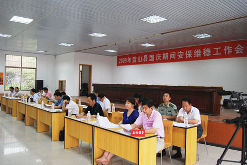 国庆节临近,为进一步营造平安和谐的社会环境,迎接新中国成立60周年。9月9日上午,全县国庆期间安保维稳工作会议在县人寿保险公司一楼会议室召开。县委副书记蔡建军主持会议。县委书记魏湘江强调:要进一步提高思想认识,切实加强领导、落实维稳责任,加大工作力度,突出工作重点,以饱满的热情、昂扬的斗志、全力做好国庆期间的安保维稳工作,确保我县社会和谐稳定。