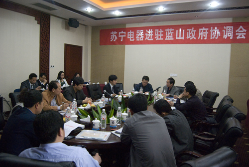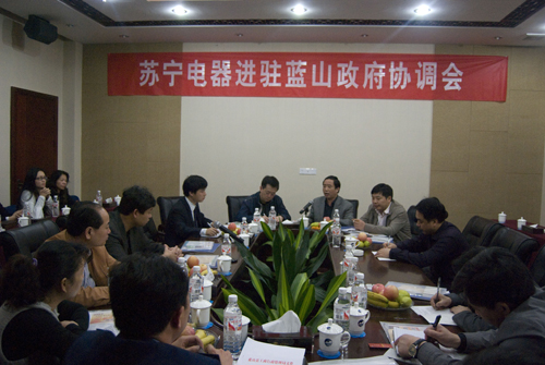 4月14日上午,苏宁电器进驻蓝山政府协调会在南海三号会议室召开,县委常委、政法委书记陈海潮,副县长郭晓武出席会议。公安局、电业局、城管局、地税局、消防中队等单位的负责人以及苏宁电器永州区负责人参加了会议。