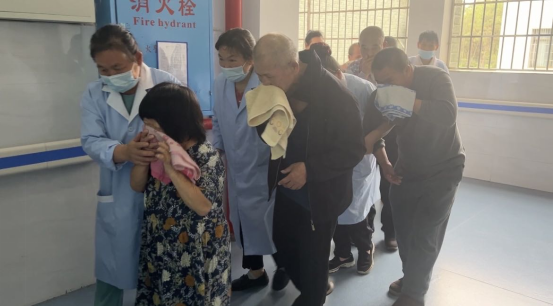 此次演练模拟当敬老院发生火灾时如何进行自救及他救。火灾现场浓烟滚滚,火势迅速蔓延,工作人员第一时间启动应急预案,火速带领老人从安全通道进行疏散,有序撤离到安全地带,并立即向上级报告火情。与此同时,利用院内消防设施(消防栓、灭火器)等开展初期火灾扑救,整个演练过程紧张有序,取得圆满成功。