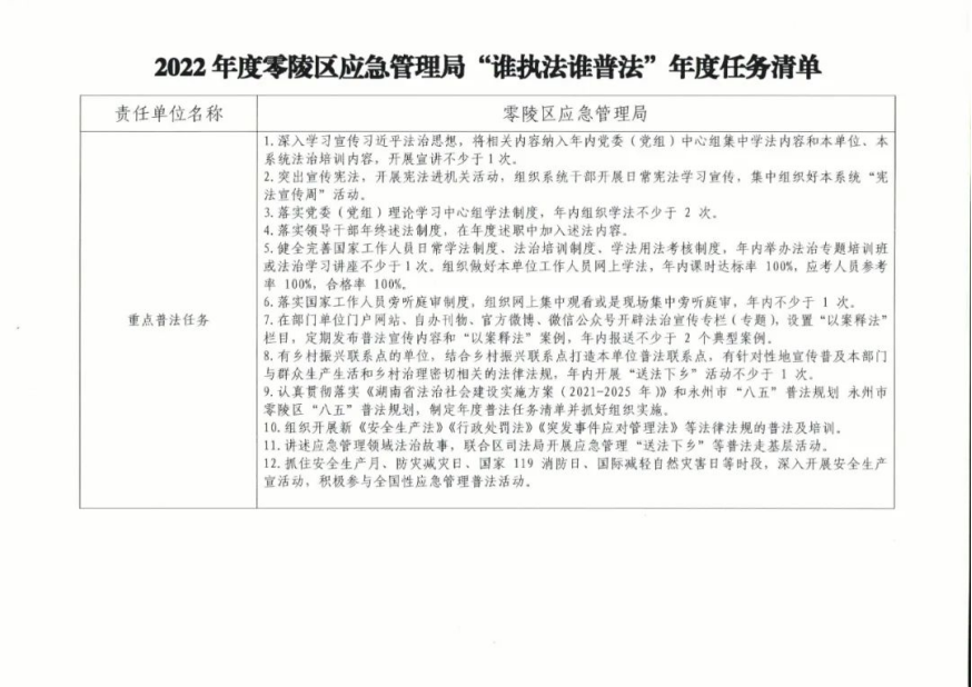零陵区应急管理局关于普法责任清单和重点任务清单的公示