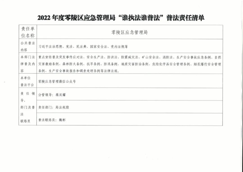 根据2022年湖南省“宪法宣传周”工作方案的相关要求,各普法责任单位,必须贯彻落实国家机关“谁执法谁普法”“谁管理谁普法”“谁服务谁普法”责任制,完成2022年《责任清单》《任务清单》并在本部门、本单位的门户网站、微信公众号等平台向社会公布,现将零陵区应急管理局2020年度普法责任清单和重点任务清单公布如下: