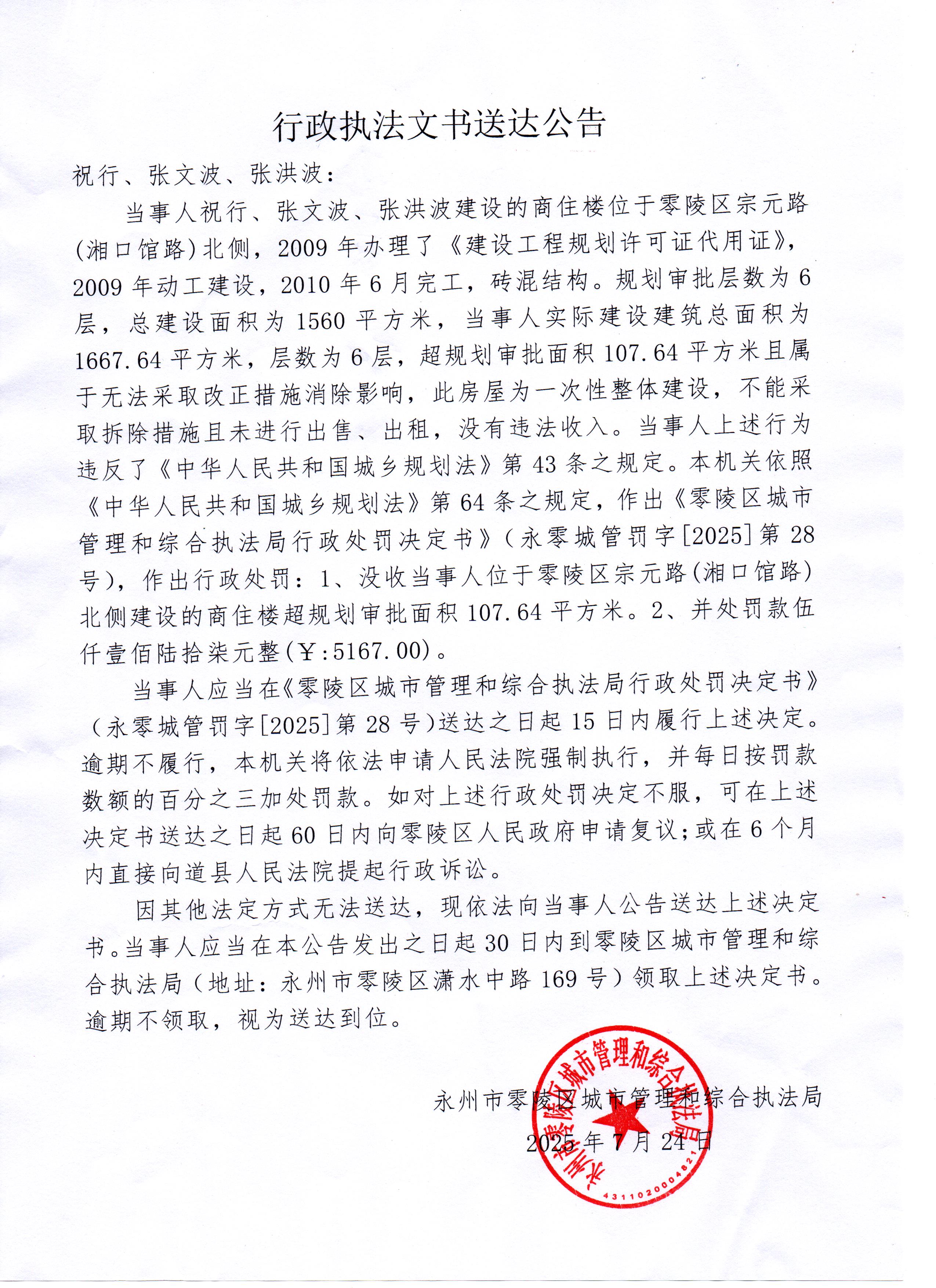 行政执法文书送达公告(祝行、张文波、张洪波)
