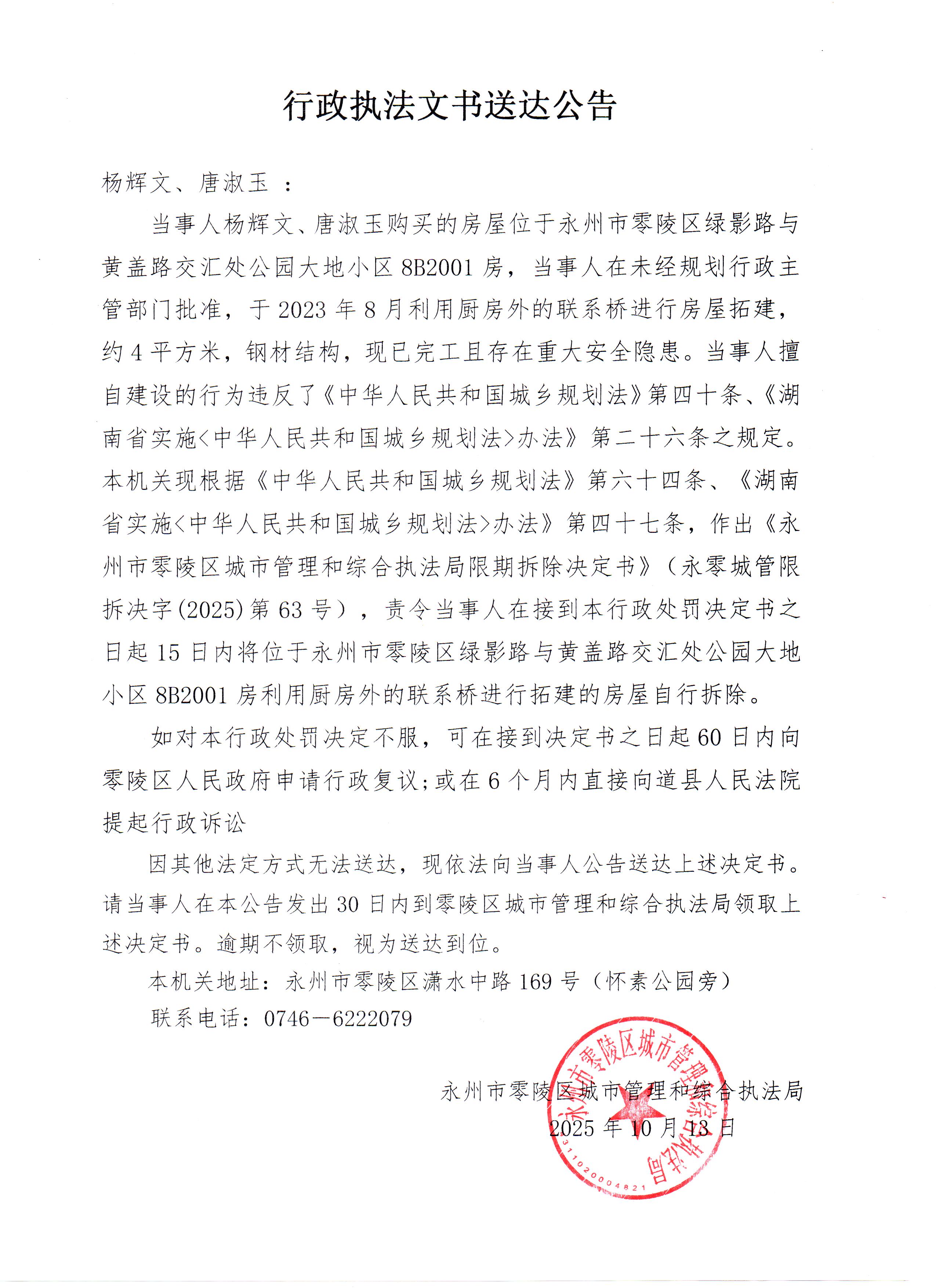 行政执法文书送达公告(杨辉文、唐淑玉)