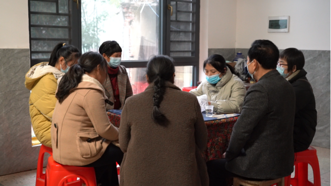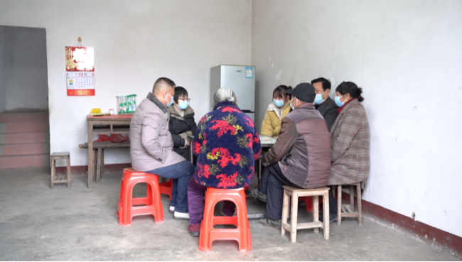 图为彭海英同志在脱贫户蒋正松家宣讲党的二十大精神